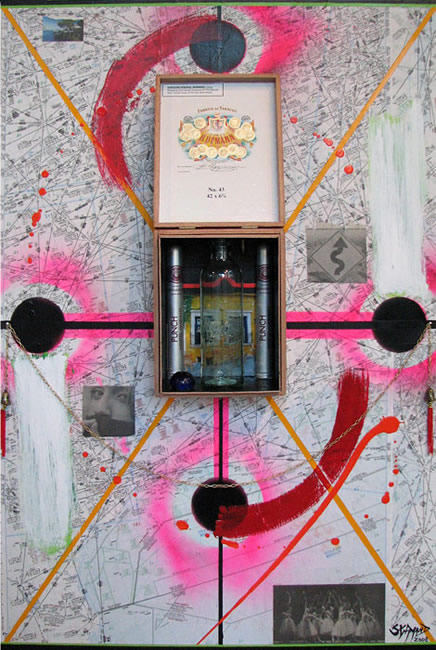 Mixed Media with Cigar Box, Coke Bottle, Flight Plan Map and Cigar Tubes.