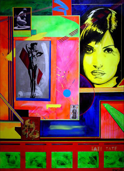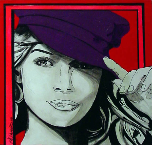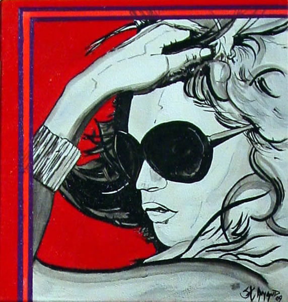 The four paintings: Versace, Armani, Deutcher Glamour & Maybelline were created as a part of the installation with the original "Slave To Vanity" from magazine advertisements from the various vendors, The colors used were to match the vanity and red chair. The formats were made as a series of four blocks to sit together with the vanity.